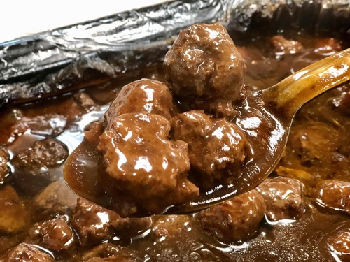 Menu: Meatballs & Gravy, Mashed Potatoes, Cole-Slaw, Applesauce, Rolls, Coffee, Milk, & Ice Cream.