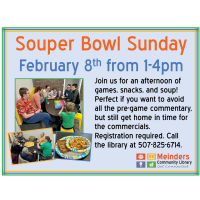 Join us for an afternoon of games, snacks, and soup! Perfect if you want to avoid all the pre-game commentary, but still get home in time for the commercials. Registration required. Call the library at 507-825-6714. ... read more